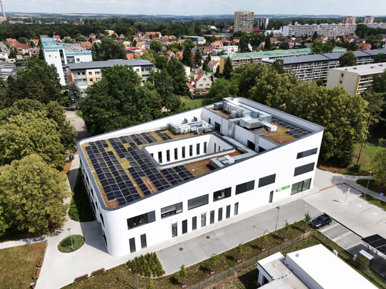 Nová budova polikliniky využívá inteligentní systémy hospodaření s energií, které podporují energetickou účinnost a snižují tak emise skleníkových plynů. Budova je vybavena geotermálními vrty, tepelnými čerpadly (země-voda), topnými/chladícími sádrokartonovými podhledy, centrální VZT (jednotky jsou vybaveny zpětným získáváním tepla, kdy tepelný výkon centrální VZT je navržen pro pokrytí tepelné ztráty větráním) a fotovoltaickou elektrárnou.